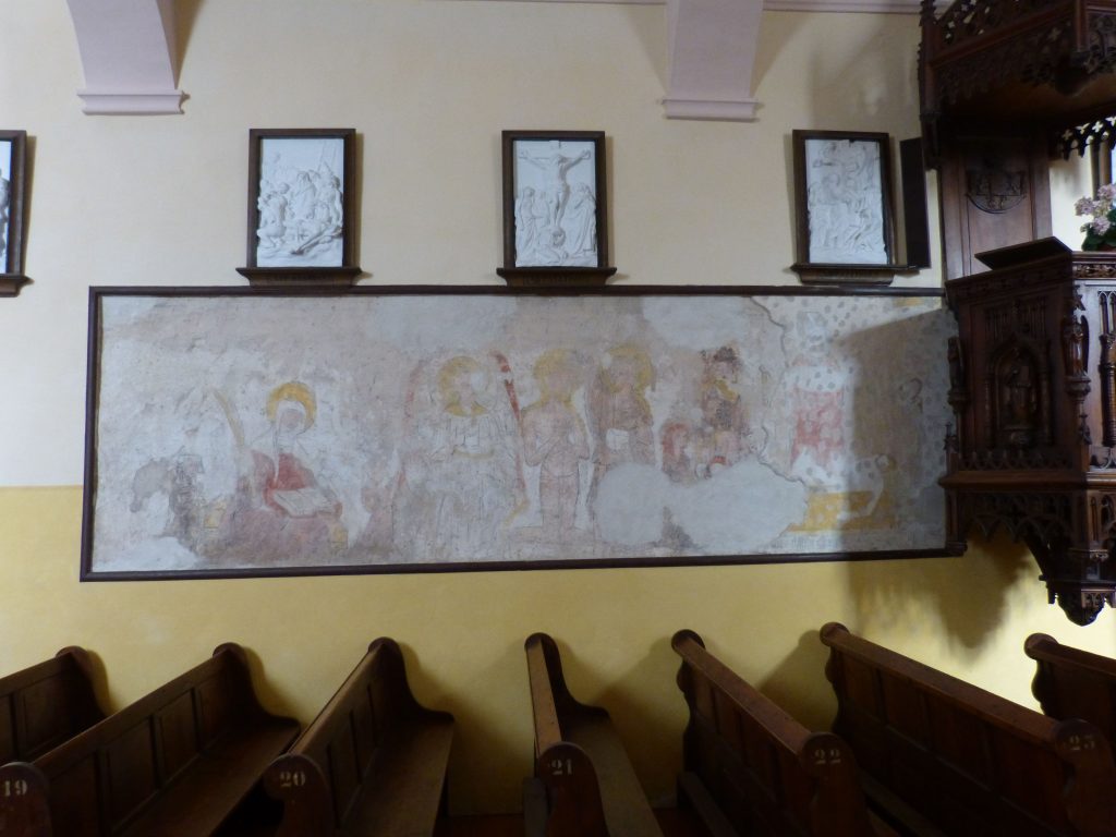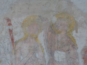 La scène suivante illustre le baptême du Christ. À gauche, un ange aux ailes rouges et blanches, auréolé, porte une ceinture jaune d’or et une robe blanche. Le Christ, debout dans une cuve, est entouré d’un nimbe doré, tout comme Saint-Jean-Baptiste, vêtu d’une robe brun-rouge et tenant dans sa main gauche une petite maison surmontée d’une croix. À côté de lui, un pèlerin, coiffé d’un chapeau sans forme et portant une barbe dorée, tient un bourdon. D’autres personnages sont visibles plus bas ». Les peintures suivantes, recouvertes d’un enduit d’environ un centimètre d’épaisseur, semblent plus récentes. Elles sont en meilleur état de conservation, bien que des piquages, destinés à améliorer l’adhérence d’un enduit plus tardif, aient causé quelques dégradations. On peut y voir un blason très mutilé, puis une représentation de Saint-Claude, en robe rouge et mitre blanche, tenant dans sa main droite une croix à palmettes dorées. Debout derrière un tombeau d’où émerge un corps, il semble bénir la scène. Sous cette image, l’inscription suivante apparaît : “SANCTE CLAUDI ORA PRO NOBIS”. Plus à droite, une scène montre Notre-Dame de la Pitié, la Vierge au nimbe doré, vêtue d’une robe rouge et d’un voile blanc. Le Christ, également auréolé, porte un nimbe formé de palmettes. Une inscription en gothique se lit sous la scène : “DOMINE SALVA NOS”. Ces fresques ne remontent probablement pas au-delà du XVIe siècle. |