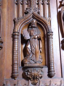 A l’intérieur de l’église : La chaire présente les quatre Evangélistes et le blason de la famille de Lévis, les donateurs.