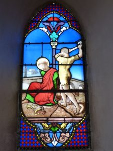 Le vitrail représente la décollation de Saint Ferréol en 304. Saint Ferréol (déformé en Forgeux, Ferjus,…), patron de l’église, était de Vienne. Compagnon de Saint Julien. Il fut décapité à Brioude pour avoir refusé de sacrifier aux dieux.